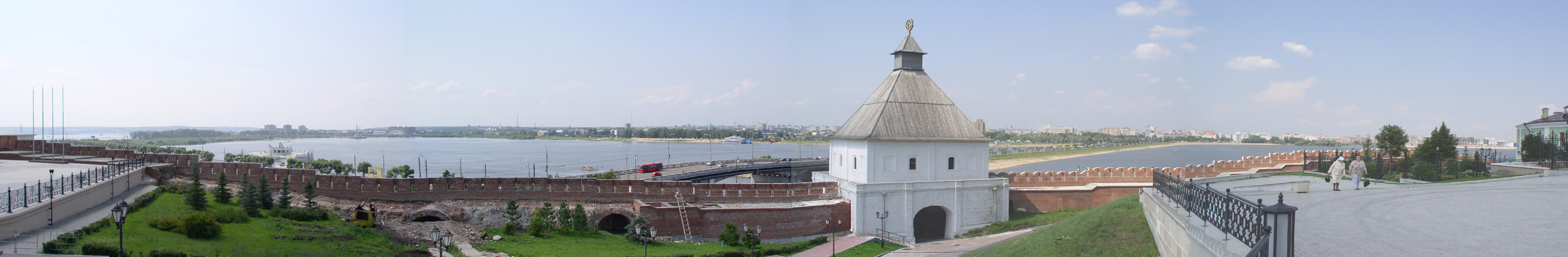 Панорама стен Казанского Кремля, Тайницкой проездной башни, Кировской дамбы и жилых кварталов правого берега реки Казанки
